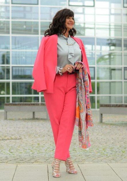 - Строгий брючный костюм может выглядеть очень женственно, если он будет сшит из ткани достаточно яркого оттенка, например, кораллово-розового. Кроме нетипичного для делового стиля, в ансамбле все достаточно строго. Костюм состоит из прямых брюк и пиджака длиной до линии бедра. К костюму добавили блузку с жабо, сшитую из серебристо-серого шёлка. Дополнением ансамбля стали высокие туфли с вырезами и также легкий шарф-палантин с рисунком.