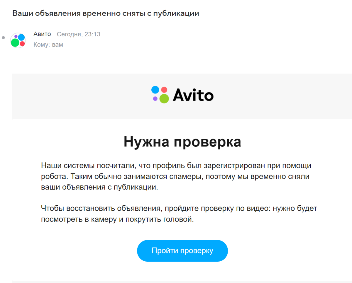 Предположил, что письмо может быть от мошенников, поэтому решил найти информацию в интернете и к моему удивлению узнал, что действительно Avito часто, без всякого повода, блокирует объявления, аккаунты и всякий раз нужно мотать головой... Более глупого и унизительного занятия представить себе не могу. Однако мне понятно, почему именно просят покрутить головой - для того, чтобы система распознавания лиц смогла убедиться, что перед камерой не фотография, а живой человек.