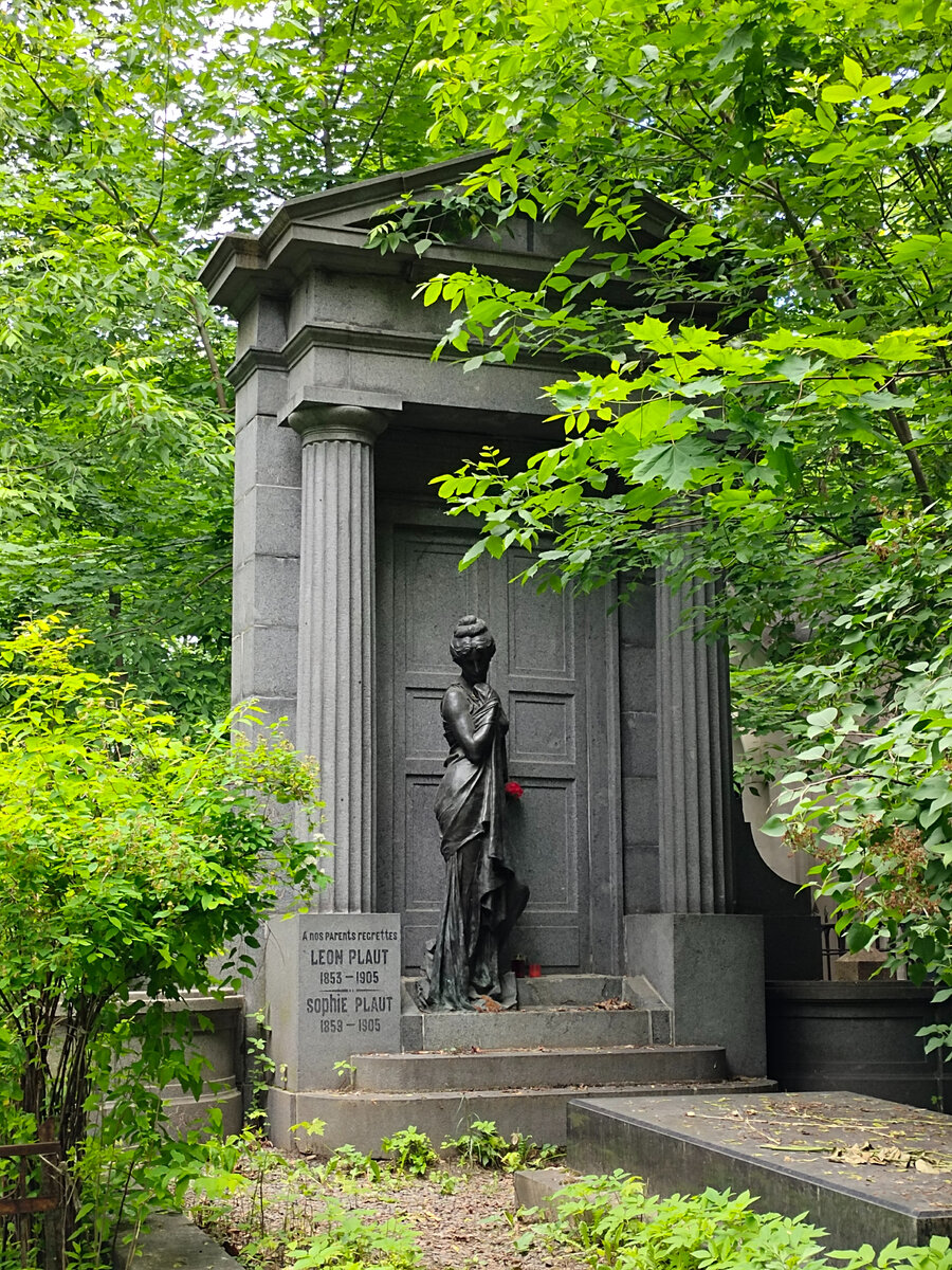 Чуть в стороне от усыпальницы Эрлангеров мы видим ещё одно удивительное по красоте и необычности надгробие – это могила французских коммерсантов Леона и Софи Пло. Муж был крупнейшим в России производителем и торговцем металлом, а Софи, дама весьма очаровательная, держала магазин перчаток на Мясницкой. Женщина слыла красавицей, и поговаривали ,что вскружила голову не одному мужчине. Супруги скончались в один и тот же год. Возможно поэтому прижилась мрачная легенда о причине их смерти. Якобы Леон Пло однажды пришёл к резчику и заказал ему композицию из камня, изображающую как неверная жена с цветком в руке спешит прочь из дома на свидание с любовником. В день, когда заказ был готов, мужчина придя домой, убил свою неверную жену и себя, инсценировав естественную смерть. Их похоронили вместе под этим каменным надгробием.