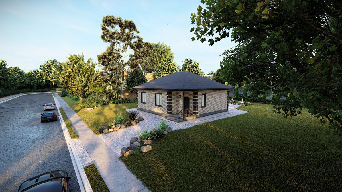 Фасад дома выполнен керамическим лицевым кирпичом 1.4НФ. Входная группа дома включает крыльцо под общей крышей дома и просторную прихожую на 4,5кв.м. В доме расположились две спальных комнаты, одна ванная, помещение котельной, совмещенные (либо раздельные) гостиная и кухня. Из гостиной можно предусмотреть выход на приусадебный участок с торца дома. Больше проектов в нашей группе ВКонтакте.