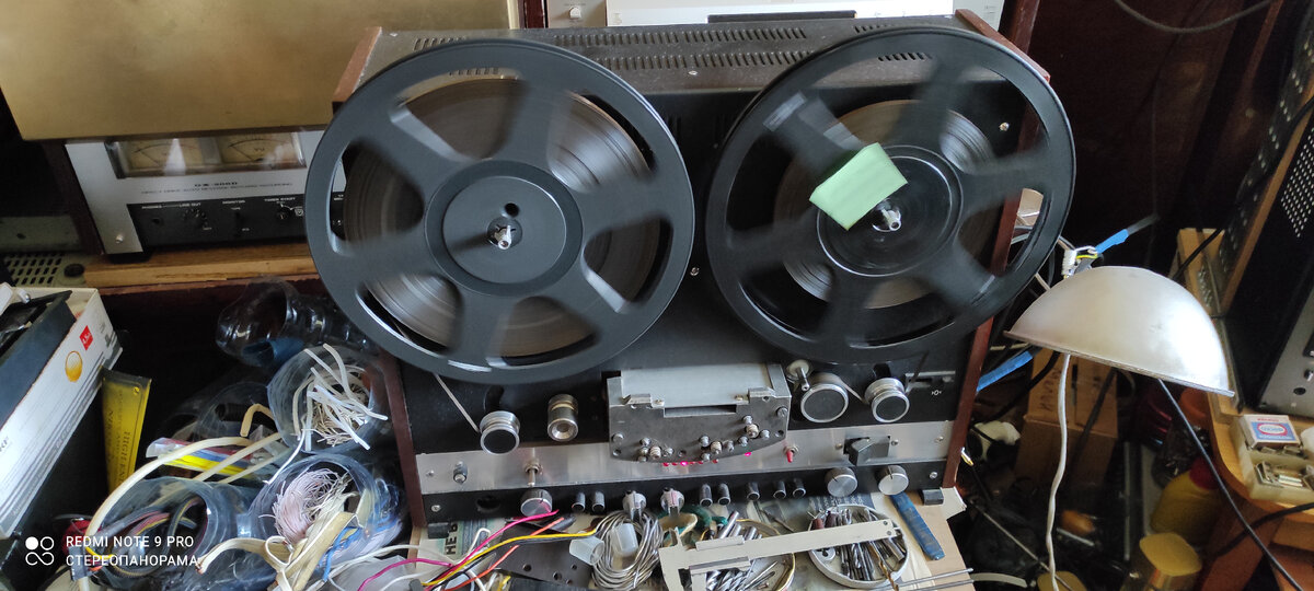 Если коротко то механика от Идели (001), а плата записи/воспроизведения от Олимпа-005. Встроенный контрольный усилитель на германиевых транзисторах и пермаллоевых трансформаторах нагружен на динамики 2ГД-36, расположенные по бокам. Блок головок от студийного магнитофона МЭЗ-15 (или 17). Головки - три. Соответственно в магнитофоне "сквозной канал" записи/воспроизведения. Из импортного в конструкции разве что конденсаторы "Ничикон". Скорости две: стандартная 19,05 и нестандартная - 28-я. Почему 28-я и нестандартная? Это прихоть создателя, а, как известно, хозяин-барин. Ах да, ещё индикация. Она от кассетника "Меркурий" (выглядит прикольно, хотя для записи мне показалась неудобной). Но звучит аппарат достойно. Пусть в моём присутствии сравнений "лоб в лоб" не проводилось, но я всё магнитофоны имеющиеся у автора слушал неоднократно (а их там десятка полтора: АКАи, Тандберги, ТИКи и т. д., причём далеко не начального уровня) и поэтому могу сказать уверенно: на фоне остальных, данный аппарат по звуку точно не потеряется. И даже звучание на встроенные динамики весьма порадовало своей "живостью". Ну а через внешний усилитель (усилители - их тоже много) и АС - тем более.