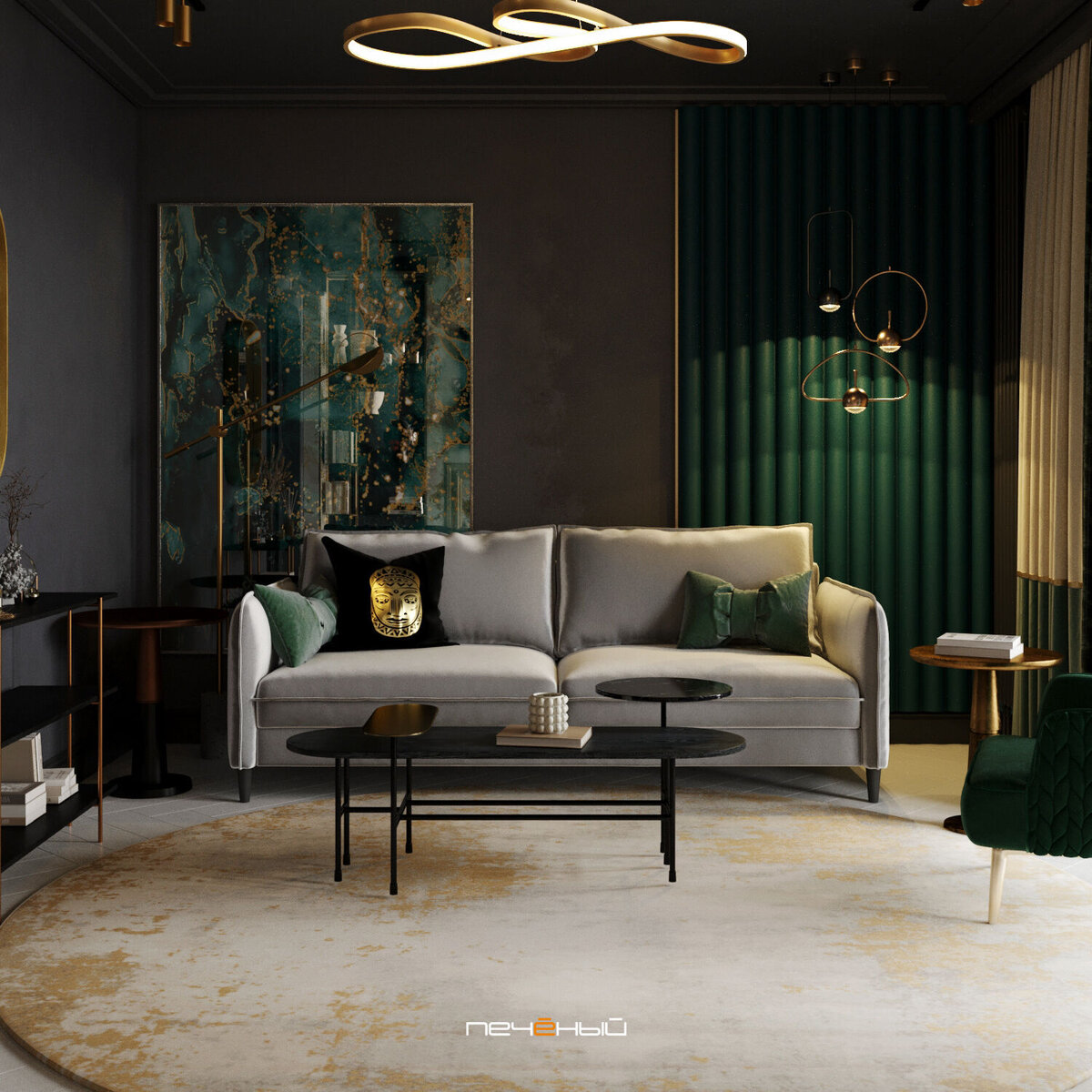 Сегодня хотим предложить прогуляться по очень необычной московской квартире, которую мы оформляли для одной барышни. И создавали мы для неё интерьер 2-комнатной квартиры в стиле ар-деко. В наши времена подобная стилистика — очень большая редкость, тем более неожиданно встретить подобное в обычной московской двушке! Что у нашей студии дизайна «Печёный» получилось? Давайте скорее смотреть! Дизайн интерьера в стиле ар-деко — стиль богатых и знаменитых, по крайней мере, так принято считать. :) Обилие камня, золота, картин, ярких красок и форм — весь этот шик и богатство выглядят несколько «киношно». Именно поэтому в повседневной обстановке такое редко встретишь. Но наша заказчица, молодая девушка, решила попробовать пожить в такой обстановке на радость нам и вам. :) Одной из задач, поставленных заказчицей, было размещение парового камина в гостиной и открытых ниш- полочек. При планировке мы реализовали эту идею, но конструктивно кондиционер на этой стене уже не помещался, а в гостиной он б