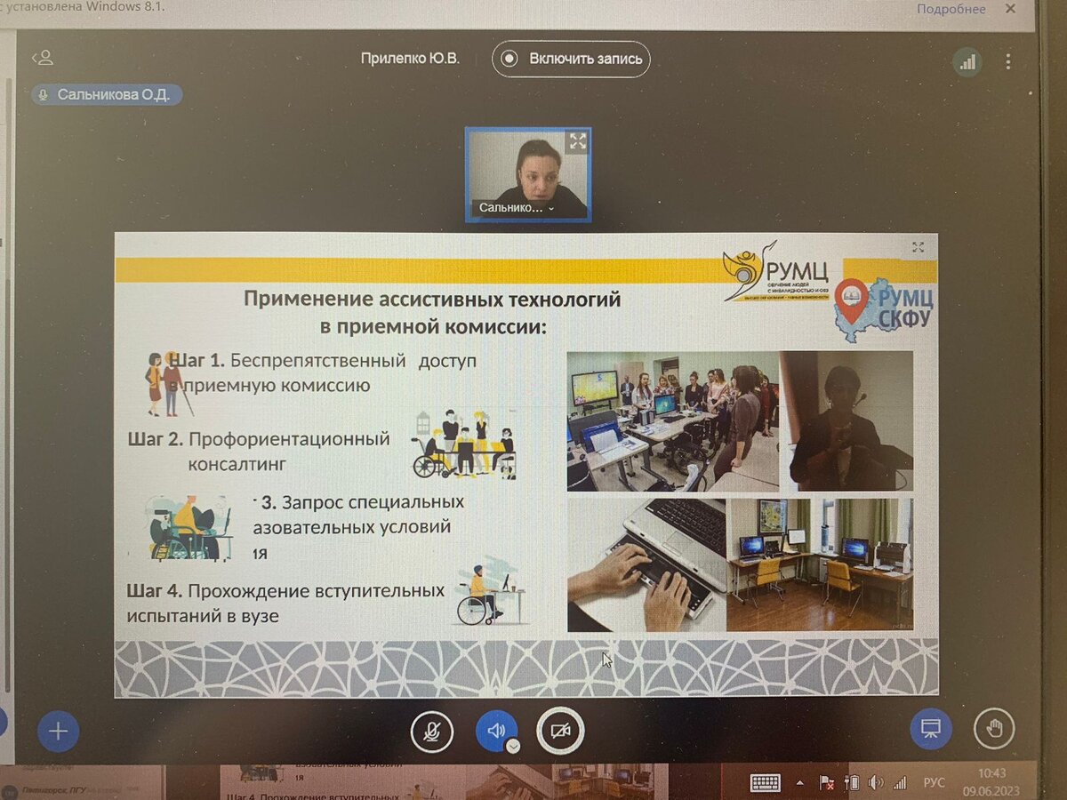 9 июня 2023 года в 10.00 состоялся вебинар на тему «Об обеспечении доступности приемной кампании 2023 г. для абитуриентов с инвалидностью и ограниченными возможностями здоровья». Целью вебинара явилось обсуждение вопросов обеспечения условий доступности поступления абитуриентов с инвалидностью и ОВЗ в ходе приемной компании 2023 год. Спикер вебинара, Борозинец Наталья Михайловна, директор РУМЦ, заведующий кафедрой коррекционной психологии и педагогики ФГАОУ ВО «Северо-Кавказский федеральный университет», довела до сведения участников информацию о показателях эффективности деятельности вузов в части заполнения особой квоты для приема на обучение по программам бакалавриата и специалитета за счет бюджетных ассигнований федерального бюджета, бюджетов субъектов Российской Федерации и местных бюджетов. Спикер вебинара, Прилепко Юлия Владимировна, и.о. главного специалист РУМЦ, доцент кафедры коррекционной психологии и педагогики ФГАОУ ВО «Северо-Кавказский федеральный университет», предостав