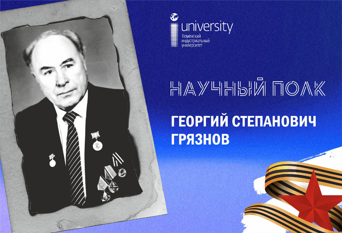 Георгий Степанович Грязнов – командир взвода курсантов в военном училище, работал заведующим кафедрой бурения Тюменского индустриального института. Родился в 1916 году в Омской области в семье крестьянина. Накануне Великой Отечественной войны был студентом нефтяного факультета Московского нефтяного института. Хотел работать в геологии, разведывать полезные ископаемые. Но этой мечте не суждено было сбыться… Как вспоминал сам Георгий Степанович «…известие о войне застало в Ишимбаево на производственной практике. Возникновению войны не удивлялся, так как страна давно готовилась к схватке с фашизмом, но был совершенно уверен, что она будет идти не на нашей территории. Так думали все. Моё участие на войне началось только в 1943 году». До всеобщей мобилизации (1943 год) студенты геологической и нефтяной специальности по решению правительства были забронированы и поэтому после окончания 4 курса Московского нефтяного института (находился в то время в Уфе) Георгий Грязнов бы направлен в военное