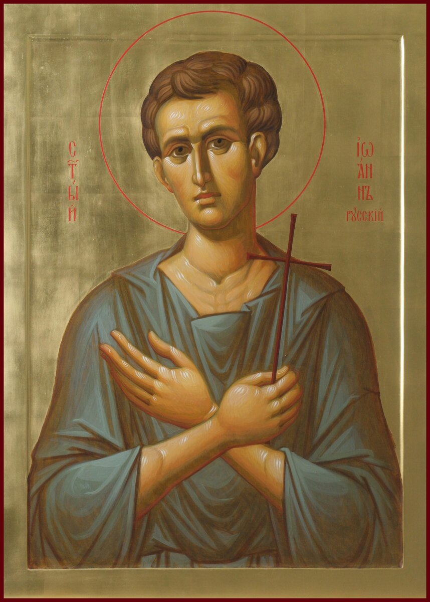 Вчестне́й па́мяти твое́й, свя́те,/ весели́тся о тебе́ Росси́я,/ во благоче́стии тя воспита́вшая,/ и целе́бным моще́м твои́м ра́дуется Аси́я,/ иде́же у́зкий путь проше́д страда́льческаго пле́на и по́стнических подвиго́в,/ сосу́д че́стен яви́лся еси́ Бо́жия благода́ти,/ ея́же проси́ и нам, чти́телем твои́м, да зове́м ти:/ ра́дуйся, Иоа́нне, благода́ти тезоимени́те.
