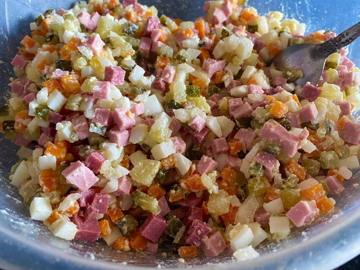 В нашей семье очень любят салат Оливье, а потому я готовлю его не только на Новый год, но и по любому поводу и без. Готовлю именно "тазиками", а салат съедается полностью уже на следующий день. Не остается и даже ложки. Даже гости удивляются потрясающему вкусу моего Оливье. А вот у многих моих подруг этот салат есть невозможно. И так считаю не только я, но и все мои домашние. И уже тем более никогда не покупаю этот салат в готовом виде в магазинах. Хуже быть ничего не может. Я считаю, что Оливье нужно готовить определенным способом, придерживаясь некоторых правил, без которых вкус салата будет безнадежно испорчен. Я озвучу несколько, а Вы можете дополнить мою публикацию в комментариях. Картошка Чем меньше картошки - тем вкуснее салат. Хозяйки привыкли класть в этот салат побольше картошки, чтобы он получился сытнее (пережитки советского прошлого), В результате получается салат пресным и тяжелым для желудка. От картошки в Оливье можно отказаться совсем, а если и добавлять ее, то по