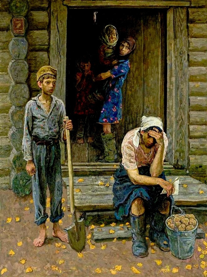 Осень 1941 года тяжелейшее время для огромной страны. Солдаты отражали вражеский натиск, а на хрупкие плечи женщин и детей легла обязанность трудиться в тылу. Вот и на картине братьев Ткачевых изображена типичная ситуация русской деревни осени 1941 года.