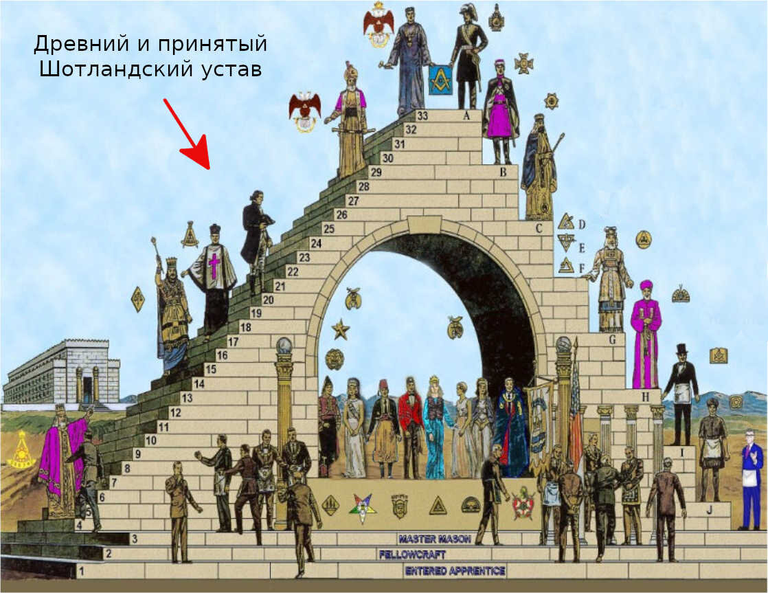 Сегодняшняя тема снова направлена на исследование загадочного Масонства. Многие люди, знакомящиеся с этой организацией и её устройством, несомненно, сталкиваются с их карьерной лестницей. В Масонстве существует признанная очень многими лестница ступеней, состоящая минимум из 33-ёх этапов на основании Древнего и принятого Шотландского Устава. Каждая отдельная ступень этой лестницы имеет двойное название. Первое - это числовое значение градуса º (угол в геометрии), а второе - это привычное нам словесное название ступени.