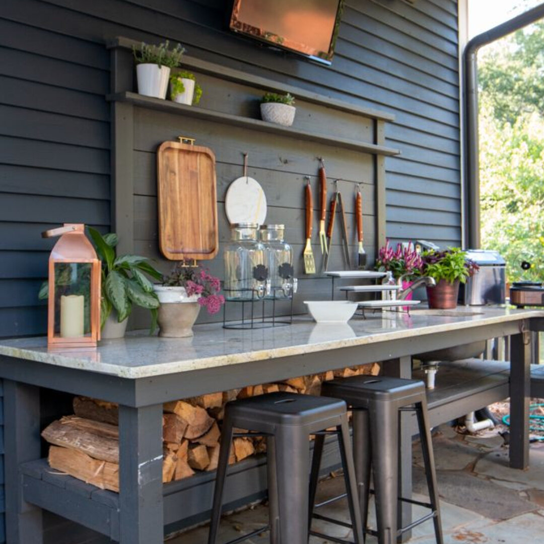 Летняя кухня с темными фасадами, подвесными полками и ярким графическим фартуком