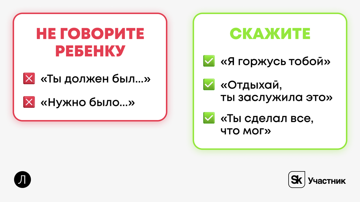 «Так и знали... Бесконечные гулянки никого до добра не доведут. Столько денег вложили в подготовку. Эх ты…» Подобными словами встречают родители выпускников с неудачного экзамена. И не задумываются, насколько сильно это ранит подростков. А у большинства впереди еще не одно серьезное испытание. Лектариум собрал советы, как поддержать ребенка в экзаменационный период. Как встречать подростка после экзаменов? Для каждого ребенка важна психологическая поддержка близких. Неважно, с каким результатом выпускник вышел из аудитории, не стоит его упрекать или ругать. Подросток должен чувствовать, что его любят при любом исходе экзамена. Даже если вы расстроены или злитесь на ребенка, не демонстрируйте эмоции. Негативная реакция только усилит эмоциональное напряжение и беспокойство выпускника. Стиль общения родителей должен, наоборот, ослабить отрицательные эмоции подростка. Для этого не используйте негативно окрашенные фразы. Что не нужно говорить ребенку после экзамена? Не оставляйте ребенка на