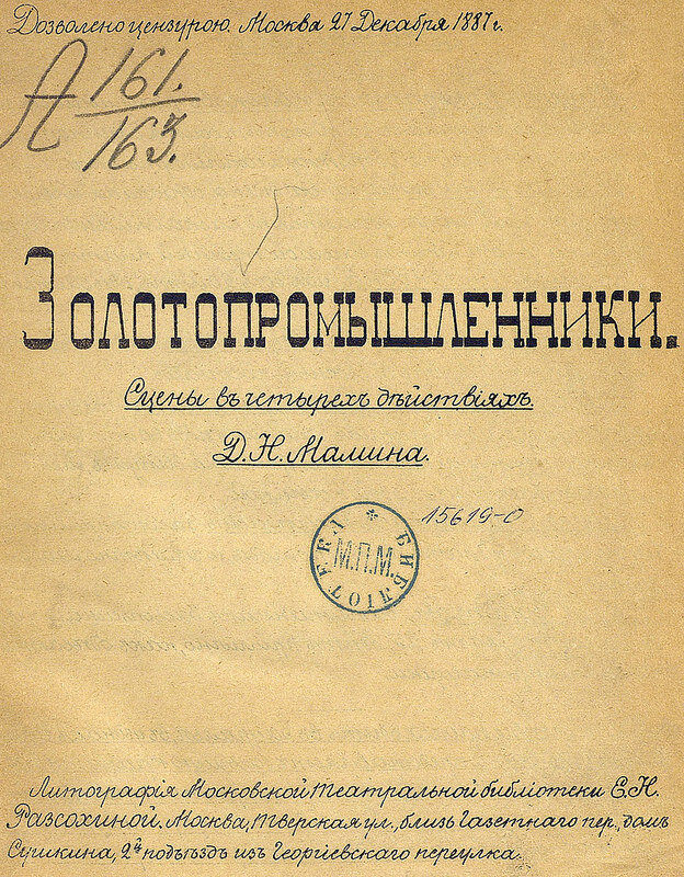 К работе над своей первой пьесой, «Золотопромышленники», Мамин-Сибиряк приступил уже зрелым художником, автором широко известных «Приваловских миллионов», «Горного гнезда», большого количества рассказов и очерков.