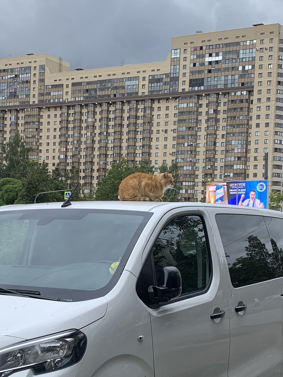 выходим погулять и видим как рыжий котик греется на теплой машинке 😄