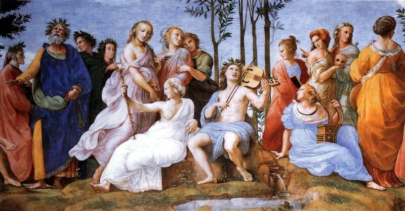 Знаменитая фреска Рафаэля «Музы на Парнасе», по версии автора, отразила вновь народившуюся элиту греков-9 Муз, но не в довоенный период, а в период великого РАСКОЛА. Греки утверждают, что современному человечеству всего 500 лет, последний век «Железный»-жестокий, героический, пришёлся на войну, именно тогда всего лишь в последнее столетие появились «Герои» (Гераклиды «россов») и появились музы. «Сегодня известно, что древние греки поклонялись девяти музам: Терпсихоре, Талии, Эвтерпе, Эрато, Клио, Каллиопе, Урании, Полигимнии и Мельпомене». Музы значит «мыслящие», интеллектуальная элита. От них происходит слово «музей». Они судили, карали и воевали. Потом Мужчины сменили жриц, им были переданы функции жриц. На картине две группы. Их разделяет РОДНИК-источник какой-то реки (может река Иордан). Считается, что это аллегорическое изображения Источника Вдохновения.
