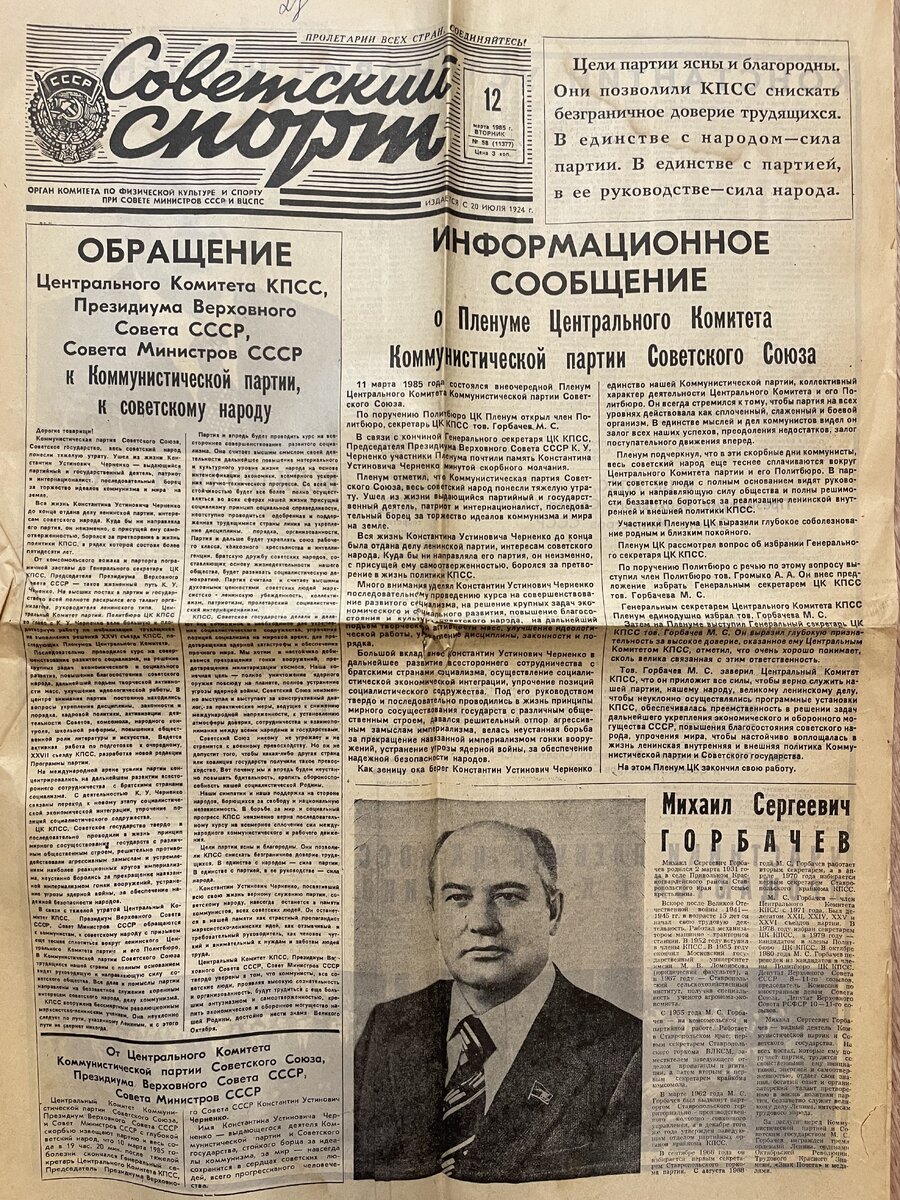 Советский Спорт 12 марта 1985 год. Смерть К.У. Черненко