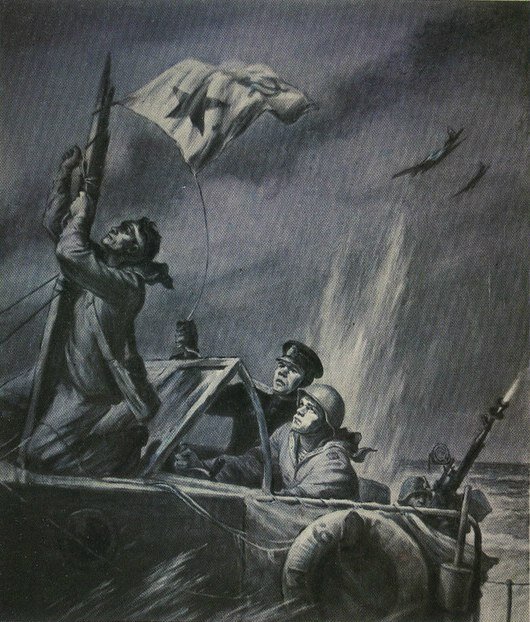 На рисунке художник запечатлел, как экипаж небольшого корабля - малого охотника МО-4 самоотверженно поднимает под огнем противника на обломке мачты сбитый Военно-морской флаг.