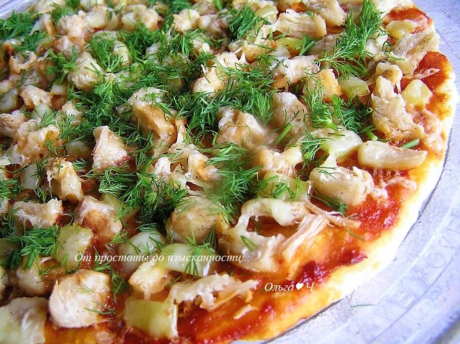 2 веточки укропа для подачи Приготовление: Куриное филе нарежьте небольшими кусочками, обжарьте на растительном масле до изменения цвета, посолите, поперчите, тушите под крышкой с добавлением 60-80 мл воды около 10-15 минут. А пока приготовьте тесто. Яйцо взбейте с молоком, добавьте щепотку соли. Всыпьте муку и разрыхлитель. Замесите не крутое тесто. Смазывая руки растительным маслом, распределите тесто прямо на стеклянном поддоне для микроволновки. Тесто смажьте томатной пастой. Выложите мелко нарезанное куриное филе и сладкий зелены