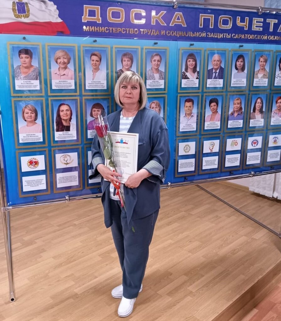 В Министерстве труда и социальной защиты области 8 июня обновлена экспозиция Доски Почета. Ежегодно этой ведомственной награды за активный, добросовестный труд и заслуги в развитии социальной сферы удостаиваются 20 лучших работников отрасли и 10 подведомственных учреждений. По традиции, смена экспозиции проходит в первой половине июня и приурочена к профессиональному празднику работников служб социальной защиты и занятости населения. Первый заместитель министра труда и социальной защиты Саратовской области Наталия Геннадиевна Гурьева вручила свидетельство о занесении на Доску Почета директору Балаковского дома-интерната Светлане Викторовне Саймаковой. Кроме того, заведующий отделением социального обслуживания в полустационарной форме Светлана Константиновна Шубенкова стала победителем регионального этапа XII Всероссийского конкурса профессионального мастерства в сфере социального обслуживания в номинации «Лучшая практика социальной реабилитации и абилитации инвалидов» в 2023 году.