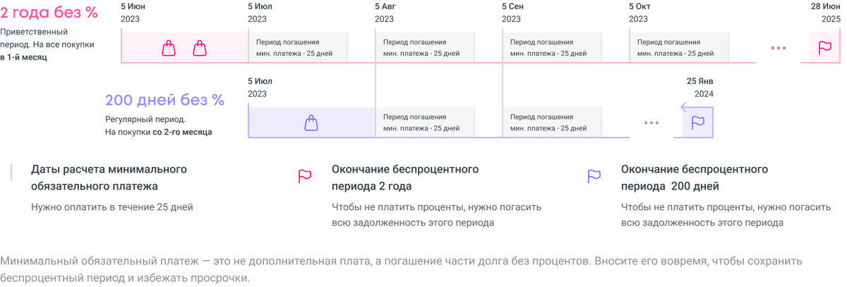 Я немного увлекаюсь коллекционирование банковских карт, которые способны приносить мне какие-нибудь полезные плюшки. Сегодня хотел бы рассказать про одну карту, которую можно использовать с определенной выгодой для себя. Взамен ушедшей в архив кредитной карте Разумная с 145 дневным грейсом, банк выпустил новую карту с беспроцентным периодом до 755 дней. Основные условия: Фишка карты в длительном беспроцентном периоде. Внутри льготного периода нужно вносить ежемесячные платежи 3% от суммы долга, но не менее 300 рублей. Снятие наличных не входит в льготный период. Банк на сайте предоставил схему - как работает льготный период в 2 года и 200 дней. Из схемы видно, что оба грейса могут идти параллельно. Особенности банка и карты. Способы применения карты 2 года без %. Оформить карту "2 года без %"