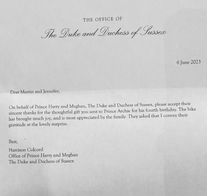 В интернете появился любопытный документ, отправленный якобы из "офиса герцога и герцогини Сассекских". Это напечатанное на бланке благодарственное письмо, адресованное неким Мартину и Дженнифер, которые, судя по тексту, подарили принцу Арчи на день рождения велосипед. Офис герцога и герцогини Сассекских 6 июня 2023 года Дорогие Мартин и Дженнифер, От имени принца Гарри и Меган, герцога и герцогини Сассекских, примите искреннюю благодарность за чуткий подарок, который вы прислали принцу Арчи на его четвертый день рождения. Велосипед принес много радости и больше всего нравится семье. Они попросили, чтобы я передал их благодарность за прекрасный сюрприз. С наилучшими, Офис принца Гарри и Меган, герцога и герцогини Сассекских Документ весьма спорный во всех отношения. Тот факт, что на нем нет личных подписей "принца Гарри и Меган, герцога и герцогини Сассекских" не позволяет быть на сто процентов уверенными в том, что он действительно послан из Монтесито. Для сравнения письмо Камиллы, н
