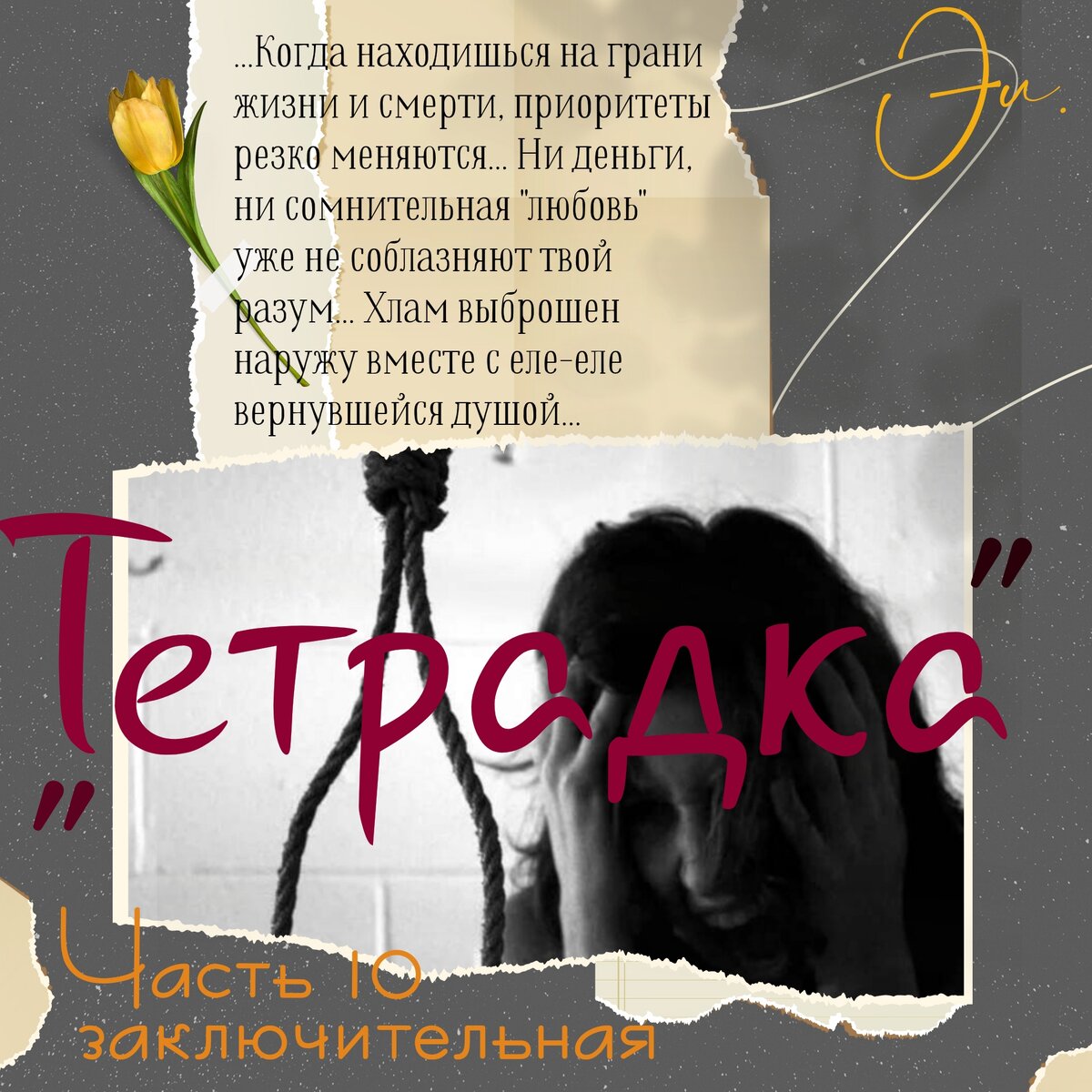 Зеленая ученическая тетрадь лежит посередине стола… Стол, застеленный белой, связанной крючком, скатертью отодвинут к окну. На потолке в центре комнаты вместо ажурного абажура медленно болтается бельевая веревка с петлёй на конце, в которую легко поместится человеческая голова… Я стою на стуле. Мои глаза, на уровне той петли, лениво и обреченно следят за ее плавными маятниковыми движениями… Эмоций ноль… Голова в петле… Центр тяжести смещен так, что стул падает на бок, переставая быть мне опорой… Резкая боль в шее… Нечем дышать… Я лежу на полу и последнее, что вижу за мгновение до того, как потерять сознание, оборванный крюк с привязанной к нему веревкой перед своим лицом… … … … - Эля не бегай туда! Забирай Рекса, и заходите в дом. Ужинать пора! – «Господи, зачем я подарила ей этого непослушного пса!» - Хорошо, бабушка! Уже идем… … Когда находишься на грани жизни и смерти, приоритеты резко меняются… Ни деньги, ни сомнительная «любовь» уже не соблазняют твой разум… Хлам выброше