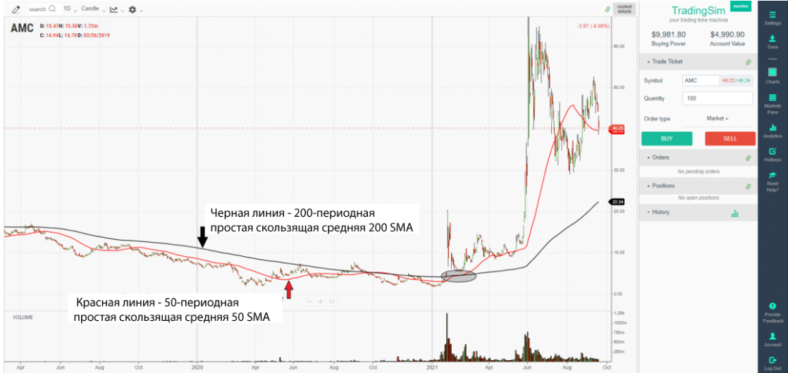 График выше - классический пример золотого креста, акции $TSLA. Темно-синяя линия на графике - 50 SMA, а красная 200- SMA.