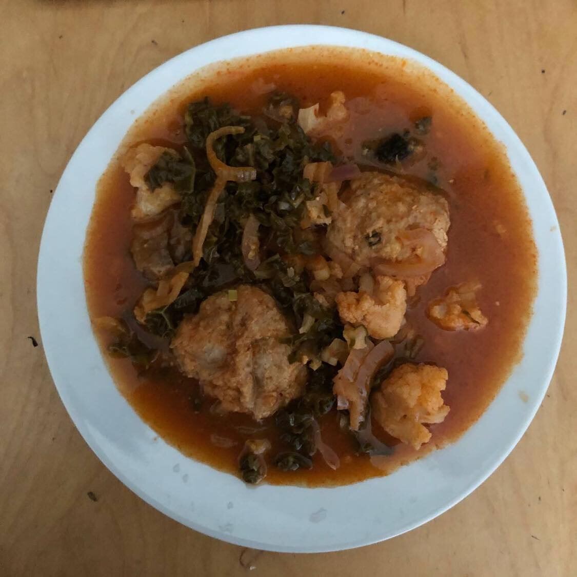 На тефтели взяла: Индюшиный фарш - 400 гр. Можно любой другой, имеющийся в наличии. На 500 гр фарша рецептура сохраняется. Мука - 1 стол.л. Я предпочитаю кукурузную или кукурузный крахмал, но в Берлине пока таковой не нашла. Но можно брать любую. Майонез - 1 стол. л. Если фарш свиной или жирный, майонез не стоит класть. У меня был не жирный, что мне очень нравится. Перец чёрный молотый - щепотку. Соль по вкусу. Сформировала шарики. Заглянула в холодильник и положила в трёхлитровую кастрюлю имеющиеся в наличии овощи. У меня было: Небольшое соцветие цветной капусты - разделила на отдельные цветочки. Два больших зелёных лопуха неизвестного происхождения ( вы можете положить, предварительно нарезанные, капустные листы) Три синие луковиц - нарезала полукольцами. Лук можно класть любой и побольше, если любите. Перец красный горький - половинку, но если нравится поострее положите целый, разрезав его пополам. Половину овощей уложила на дно , сверху тефтельки и прикрыла овощами. Залила соусо