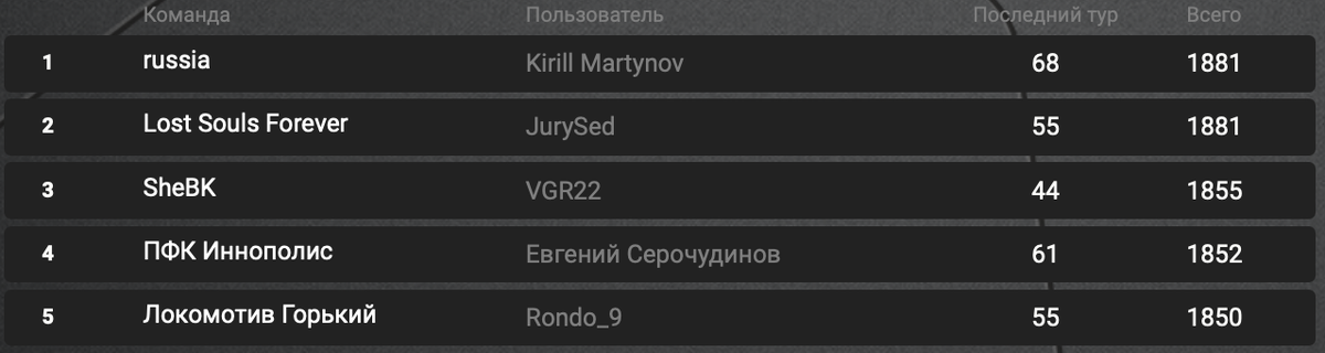 Европейский футбольный сезон почти полностью завершен, нам осталось дождаться только финала Лиги Чемпионов, а пока мы можем подвести итоги остальных fantasy-турниров и вручить победителям их награды. Со всеми победителями и призерами в ближайшее время мы свяжемся по внутренней почте на Sports.ru. В случае не получения ответа мы свяжемся по почте указанной в профиле аккаунта. Итак, победители и призеры: Плей-офф Лига Европы 1-е место – VGR22. Приз – Apple Watch, звезда и бейдж в профиле; 2-е место – BiGSHOWdRAMA. Приз – Apple AirPods Pro и бейдж в профиле; 3-е место – ZidaneZ. Приз – промокод в маркетплейсе и бейдж в профиле. РПЛ В РПЛ у нас первые два места набрали одинаковое количество очков. В данном случае мы объявляем победителями обоих игроков! Оба игрока получают свои звезды и бейджи. К сожалению, физические призы для фэнтези-турниров у нас только в одном экземпляре. Поэтому определить его получателя было необходимо. Для выявления победителя при равенстве очков было решено воспол