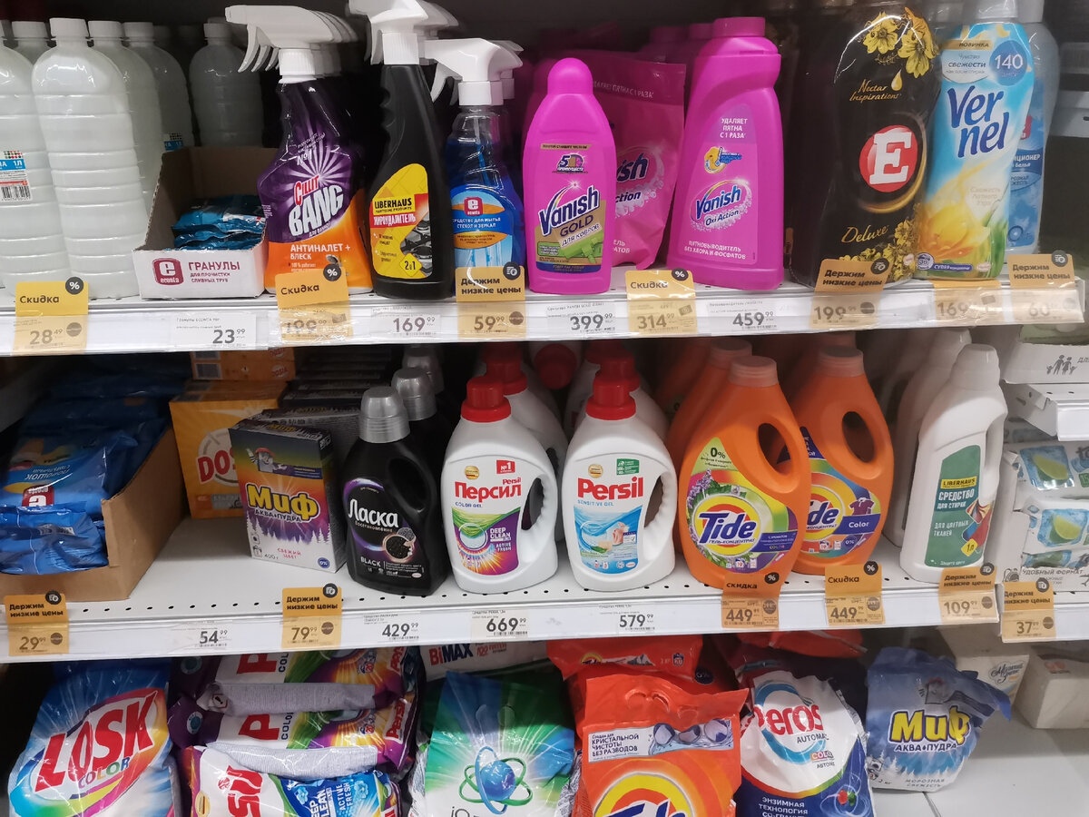 Начала с бытовой химии, т.к. дома закончились все средства для стирки. Планировала что-то побюджетнее выбрать, но чтоб отстирывало нормально, поэтому поначалу засматривалась на популярных производителей. "Tide", например, ща 449-469 рублей вполне можно купить, у него не особо большой расход и стирает он вещи отлично, не было к нему нареканий за все время покупок. Чуть правее расположился неизвестный мне гель для стирки цветных вещей, но до чего же красивая цена у него - 109 рублей.