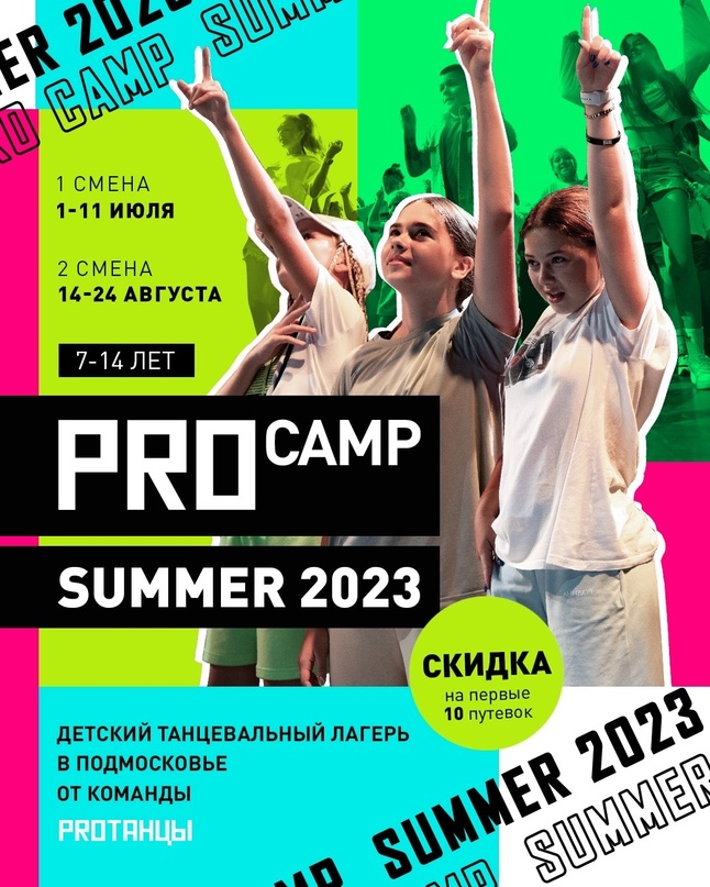 Летний танцевальный лагерь PROCAMP для детей 7-14 лет (уровень танцевальной подготовки любой)! PROCAMP SUMMER — это уникальная возможность провести лето не просто активно, а безгранично восхитительно Вашего ребенка ждут: Мастер-классы от участников главного танцевального шоу на ТНТ Много творческих активностей, а также прогулки на свежем воздухе, купание в бассейне и конечно же бесконечные позитивные эмоции Вау? Конечно!