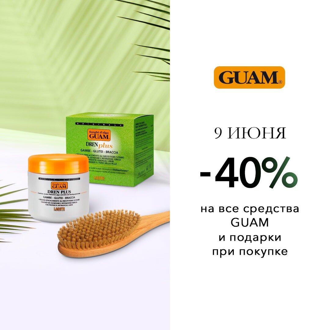 У всех пятница! А у нас скидки и подарки! В Интернет-магазине Иль де Ботэ 9 ИЮНЯ День Марки GUAM! -40% НА ВСЁ и ПОДАРКИ ПРИ ПОКУПКЕ: 1) При покупке косметических средств марки GUAM на сумму от 3 000* рублей Щетка для сухого массажа тела в подарок 2) При покупке косметических средств марки GUAM на сумму от 10 000* рублей Маска антицеллюлитная с дренажным эффектом DREN PLUS, 500 г в подарок *Сумма указана после применения скидки GUAM предлагает только лучшее!