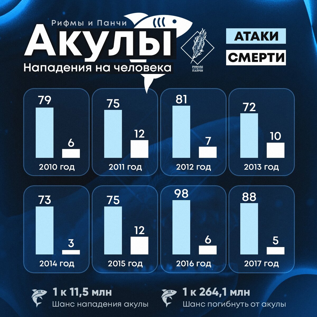 🦈 В связи с последними событиями собрали небольшую инфографику с официально подтвержденными случаями нападений и смертей людей от акул за последние годы. В среднем, акулы убивают по семь человек в год по всему миру. Для сравнения, люди убивают 100 миллионов акул ежегодно — примерно по 11 000 акул круглосуточно каждый час. Шанс быть убитым акулой ничтожно мал. Он ниже, чем шанс умереть после укуса комара, разносящего инфекцию. Более вероятно погибнуть от атаки муравьёв — в среднем в год они убивают тридцать людей.