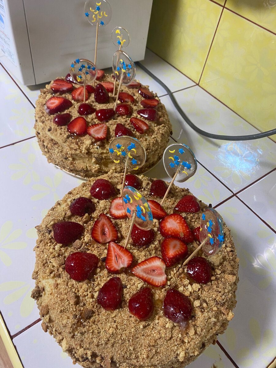 В свой выходной решила семью побаловать тортиком. В первую очередь варю крем. на 2 литра молока ; 2 желтка,1.5 стак.сахара,ванилин,4 ст.л.кукурузного крахмала,2ст.л.муки. 100 гр.сливочного масла. Затем начинаю делать тесто (я делала 2 порции). 1 стакан сахара,2 яйца,3ст.л.меда,150 гр. сливочного масла,1ч.л.соды,400гр.муки. по рецепту тесто получилось не очень густым и я чуть больше муки взяла затем тесто я оставила в холодильнике на 30 минут Выпекала коржи в духовке и пока горячие вырезала ровный кружок,а обрезки оставила на крошку. Смазала уже остывшем кремом и обсыпала крошкой. убрала в холодильник на ночь а украсила уже утром. Вот такой замечательный торт получился! А какой вкусный непередать!!!!!!