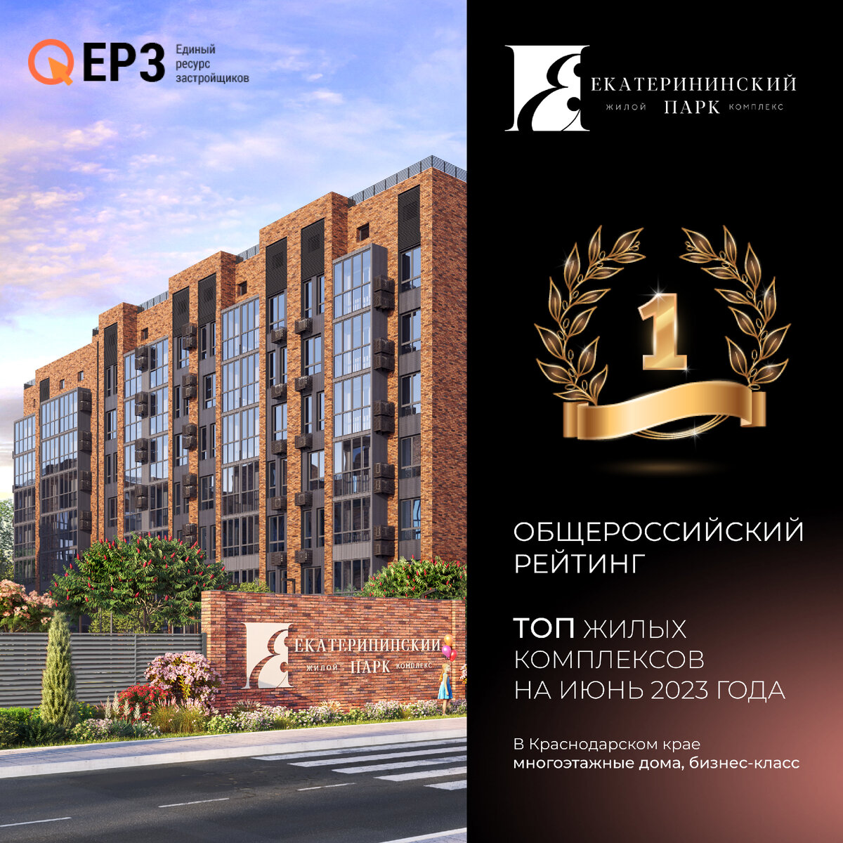 ЖК «Екатерининский Парк» на 1 июня 2023 года стал первым среди многоэтажных жилых комплексов бизнес-класса в Краснодаре в рейтинге ЕРЗ.РФ.🥳