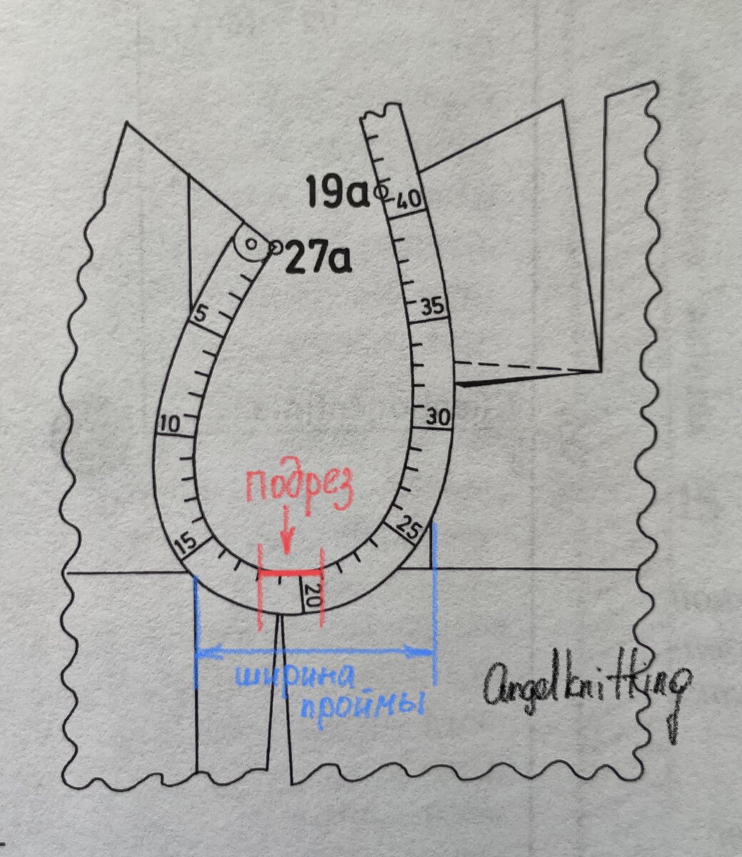 Я добралась до подрезов в полосатом кардигане и решила поговорить серьезно: что это за зверь и с чем его едят. Когда говорят про подрез, ясно только одно: речь идет о месте подмышкой. Понятия, же, закладывают в это слово разные. И пока разберешься…. Разбираться буду на примере базового кроя нормальной посадки с втачным рукавом. Принимаем за данность, что подрез в вязании - это место, которое принадлежит и пройме и рукаву. А вот величина «этого места» варьируется от авторитетного мнения. Думаю, не только я много раз слышала, что величина подреза есть 1/3 ширины рукава ( помним! речь о базовом рукаве). Часто в круглых кокетках такие рекомендации, в разных регланах связанных сверху. Что такое с точки зрения конструирования 1/3 ширины рукава? Это величина ширины проймы. А вот теперь давайте посмотрим. Что будет, если всю величину проймы отдадим и телу и рукаву… Думаю, наглядно видно, что ничего хорошего. Особенно, если размер больше 44 и полотно чуть постабильнее лайкры.