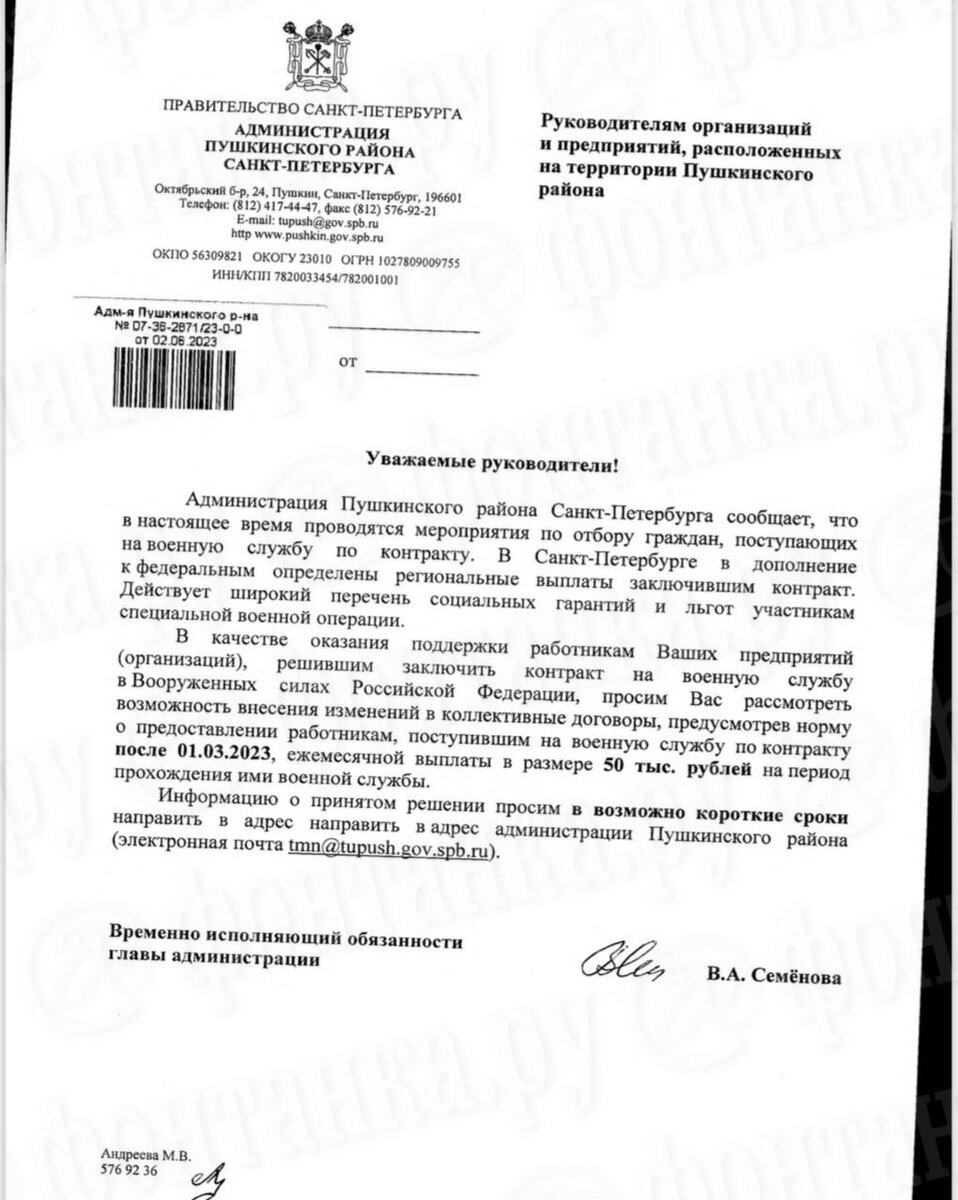 Власти Петербурга предложили бизнесу доплачивать сотрудникам, которых отправили на фронт Администрация Пушкинского района Санкт-Петербурга разослала предпринимателям предложение поддержать своих сотрудников, которые ушли на фронт. В письме говорится, что чиновники рекомендуют доплачивать таким работникам ежемесячно по 50 тысяч рублей. Письмо опубликовала в своём телеграм-канале журналистка Ксения Собчак, аналогичные документы предоставили «Фонтанке» получившие его бизнесмены. Как говорится в обращении, выплачивать такие суммы предлагается только тем, кто заключил контракт после 1 марта 2023 года. Как рассказал «Фонтанке» один из предпринимателей, письмо получили около 500 организаций, которые работают в Пушкинском районе. Ещё один собеседник «Фонтанки» отметил, что письма рассылали после одного из совещаний оперативного штаба при губернаторе Петербурга. В других районах города, впрочем, нашему изданию сообщили, что подобных писем не рассылали. Собеседники «Фонтанки» в Смольном в целом