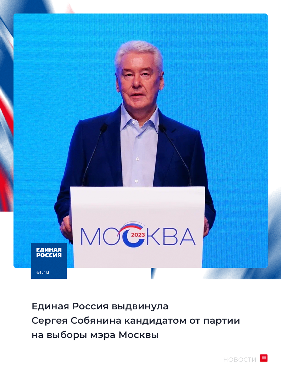 ✅ Сергей Собянин пойдет на выборы мэра Москвы, как кандидат от Единой России. Об этом заявил секретарь Генсовета партии Андрей Турчак на региональной партийной конференции в Москве.
