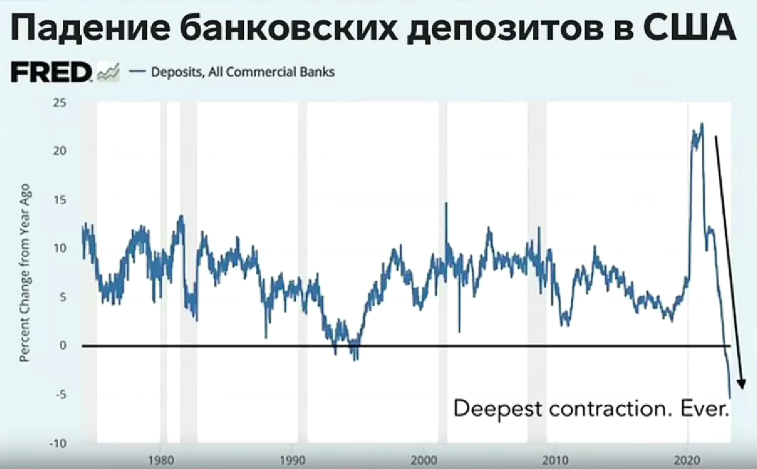 Экономика и банковская система США, невзирая на все усилия, находятся в стадии падения так же как и американские поезда. После того как Байден договорился с республиканцами и они подняли потолок государственного долга, тут же, как будто прорвало плотину и этот долг вырос на 350 млрд. долларов. Банки продолжают испытывать большие сложности, туда опять закачивается огромное количество денег, потому что граждане начали рекордно снимать своих средства. По графику видно, что в пандемию был всплеск депозитов (вложений в банки), так как деньги раздавали чуть ли не с вертолётов и люди несли их в банки. А сейчас пошло изъятие депозитов и всё пошло вниз. Поэтому в некоторых банках начались проблемы с выдачей денег. А Европа в своём ВВП два квартала подряд показала минус, что означает официальную рецессию. Падение первых банков показало, что паника через соцсети распространяется так быстро, что у ФРС и банков нет времени принимать обдуманные решения и предпринимать какие-либо меры, поэтому и