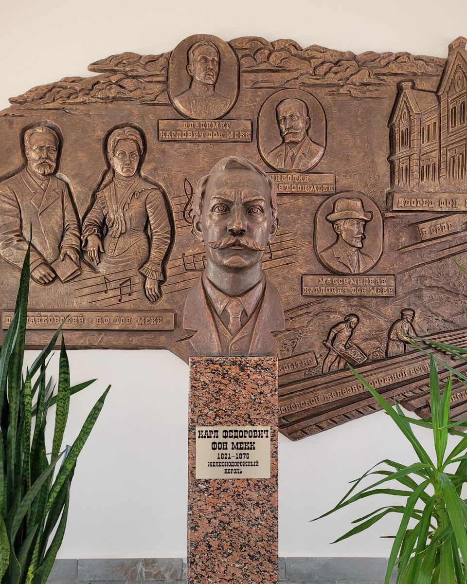 Напоследок я оставила самую сложносочинённую историю из Венёва. Разобраться с ней было не так-то просто — спасибо нашему гиду Денису за помощь. И для начала предлагаю вам посмотреть фото и сравнить два здания — городского вокзала и усадьбы фон Мекк, которая находится в окрестностях. Они очень похожи... ...и это неудивительно. Во-первых, создатель один — Сергей Эскарев. Это архитектор, служивший в управлении Государственных железных дорог. И вот в месте его работы кроется как раз во-вторых. Потому что объединяет два дома семья железнодорожного короля Карла фон Мекк. Его бюст стоит в здании вокзала... ...хотя напрямую именно он к Венёву отношения не имеет. С городом связана супруга Карла Фёдоровича — баронесса Надежда фон Мекк. Местные богатеи по сути дали ей взятку для того, чтобы железная дорога прошла здесь. Отдали за бесценок имение в окрестностях — в местечке Хрусловка. Сработало — сначала в конце XIX века... ...появилось роскошное неоготическое здание в усадьбе, которую Надежда Фил