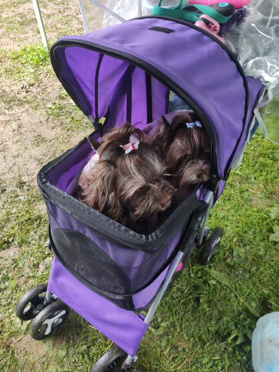 Последняя выставка была самая веселая. С самого утра шел дождь. Накануне папа уехал куда то. Утром встали мы не очень рано, мама посадила нас в колясу. Собрала наши вещи и поехали мы на выставку своим ходом. Хорошо, что с нами поехал кожаный брат. Добирались до выставки долго, на автобусе - метро- автобусе. Шли через парк под сильным дождем и наконец то мы были на месте. Оказалось, что ринги немного задерживаются. Хорошо, что там были палатки, куда можно было встать и укрыться от дождя. Но все равно было холодно. Сначала мы не сильно мёрзли, но шло время и наша очередь все не подходила. Мы начали замерзать. После первого ринга, мама завернула нас в плед. В целом все прошло хорошо, мы получили оценки "отлично". Каждый сходил на три выставки. Нас теперь даже выпускают в бесты. На одной выставке, в бестах заняли 1 и 2 место, а на другой 2 и 3. Обратно добирались тоже своим ходом. Уставшие, грязные, но очень довольные.