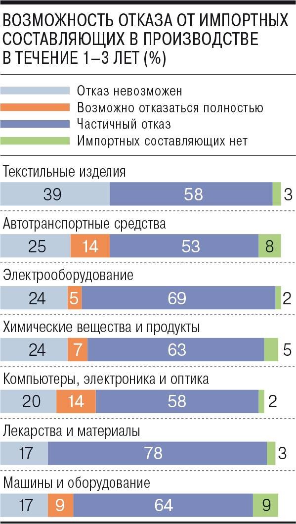 В краткосрочной перспективе возможен в основном фрагментарный отказ от импортного оборудования, комплектующих, технологий и сырья в производстве: частично отказаться от них смогут около 60% компаний на горизонте до трех лет. Еще 18% считают отказ невозможным и менее 10% уверены в возможности полного перехода на отечественные составляющие.