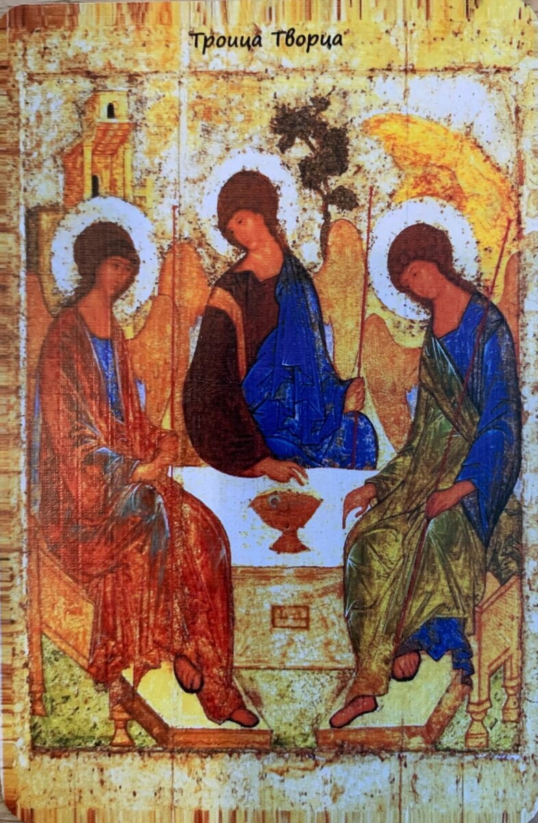 Христианская икона Святая Троица. Староверческая – Троица Творца. Это икона антагонична миром соединения трех ипостасей. Света тройственность в том числе – ранее считалось что свет исходит от солнца, звезд и глаза. Отсюда выражение – свет очей моих. Тройственность может быть во многом. Материя, свет, разум. Первооснова, первовещество, первоэлемент (например, в языко построении слов, писал). Навь, явь, правь – это тоже про эту икону. Три ангела, три кия, Кубок на колумбарии-саркофаге и человек в кубке как результат. КолУмБарий – Единица начала благо рождения через разрушение. СаркАфак – порт казящего поглощения в следующую жизнь. Ранее на Руси просто высыпали пепел земле (и это обязательно) и ложили сверху плиту спазеро из под которой должны были торчать два конца червоной нити-ленты завязанные сверху бантом. БаНТ – Удивление, Названное Творцом. Кстати, лента «живые помочи» именно отсюда и допускалась мера обережительной талии - 81 см (аршин с ладонью) для женщин и 91 см
