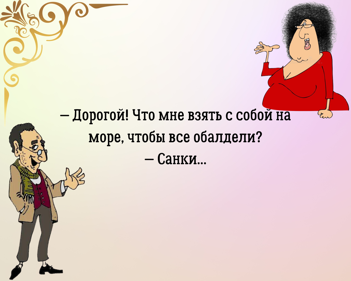 И снова с вами Говорим обо всем. Здравствуйте. Еще недавно радовались приходу весны, а уже на подходе сезон отпусков. Пора определиться с видом отдыха, наметить маршрут, начать готовить багаж, завершать начатые дела. Что может быть прекраснее долгожданного отдыха. Море, солнце, пляж… Но пока это все в планах, предлагаю пошутить на тему отдыха и всего, что с ним связано. Поехали! Сотрудник одной из тель-авивских фирм заходит в кабинет к директору: — Извините, ну, когда же, наконец, вы дадите мне отпуск? — Отпуск, отпуск ... Ты и так все лето у открытого окна с видом на море сидишь! Две одесситки собираются провести отпуск на Средиземном море. — Вот не знаю, какой купальник брать — открытый или закрытый? — Бери оба. Вдруг вода будет холодная. На израильской таможне сотрудник обращается к Рабиновичу: — Извините, но у вас проблемы с фотографией в паспорте. — Какие проблемы?!! Вон я, третий слева! На отдыхе одним из важных вопросов становится вопрос жилья. Кто-то останавливается в отеле,