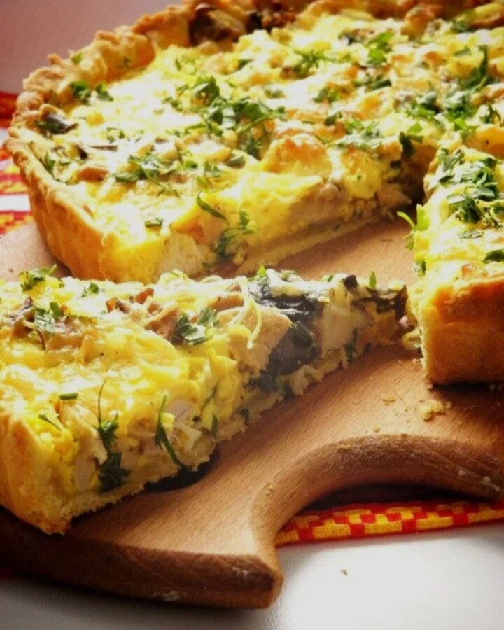 ИНГРЕДИЕНТЫ - СыР 🧀 -100 гр. - ЛуК 🧅 - 2 шТ. - МаслО (расТителЬноЕ - 3 ст.л. - КарТофеЛь -3 шт. - КуриНоЕ бедрО🍗 - 2 шТ. - ГриБы (шамПеньЁны - 150 гр. - СолЬ 🧂(щепОтКа - ПереЦ🧂(пО вкуСу - СлиВки - 150 гр.(нЕ жирНых - ТесТо (слоЁноЕ - ЗелеНь🥬 (пО вкУсУ ПРИГОТОВЛЕНИЕ ЛуК🧅 нарЕзАеМ полУколЬцаМи, каРтофЕль (на полОскИ. 🧑🍳 БерЁм скоВорОдКу налИваЕм масЛо и обЖариВаеМ лУк с карТошЕчКоЙ. ДалЕе курИнЫЕ бёдРа 🍗 нарЕзаеМ нА тонеНькиЕ поЛоСоЧки и добавляем к нашиМ овоЩАм . ГрИбОчКи наРезаеМ (прОизвоЛьно, добАвлЯем. СолиМ🧂 , перЧиМ🧂. ВливАеМ слИвкИ. ДоВодИм всЁ дО киПениЯ, а поКа берЁм дВа кусоЧкА слоёного тесТа ,выКладыВаеМ иХ в нахлЁст и раскатЫваеМ . БерЁм форМу длЯ запеканиЯ ,лоЖиМ наше тестО с нахЛёстоМ нА борТиКи . ВЫкладЫваЕм начиночКу в наШ пирОг ,посЫпаЕм тёРтЫм сЫроМ🧀 СхватЫваеМ краЯ вО внуТрь и отпрАвлЯем в духоВоЙ шкаФ разогРетЫй дО 190 ° нА 40 миН.⏳ ПоСле приГоТовЛениЯ поСыпАеМ зеленЬю🥬 ДобАаавоЧки😋 ⭐⭐⭐⭐⭐
