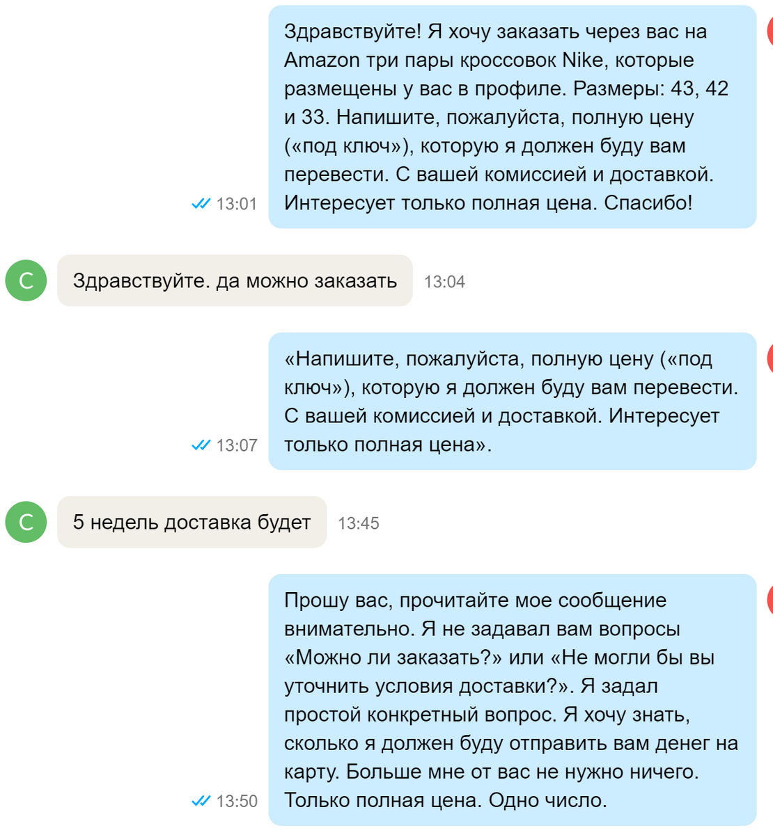 Расскажу очередную смешную историю про «Авиту». Мы с семьей читаем эту переписку уже третий день и хохочем до упаду :)) Есть такой тип людей, которые не в состоянии просто внимательно прочитать текст или вычленить смысл написанного. Как правило, этим недугом страдает старшее поколение — мозг стареет, нейронов становится меньше, скорость реакции и глубина мышления сокращаются. Но бывает и среди молодых встречаются такие. Ну и встретился мне опять такой «кадр». Я частенько заказываю что-нибудь из-за границы. Просто потому что там дешевле и качественнее, чем в России. А благодаря Путину за рубежом не принимают ни одну российскую карту, поэтому приходится пользоваться услугами так называемых «байеров» (это люди, которые живут в Европе, и за 5-10% от стоимости товара готовы его купить и отправить в Россию через Казахстан). Ну и вот, пишу такому байеру: Человек просто не может прочитать написанное. Он читает одно, а потом его мозг каким-то образом превращает это в вопросы, которые я не задав