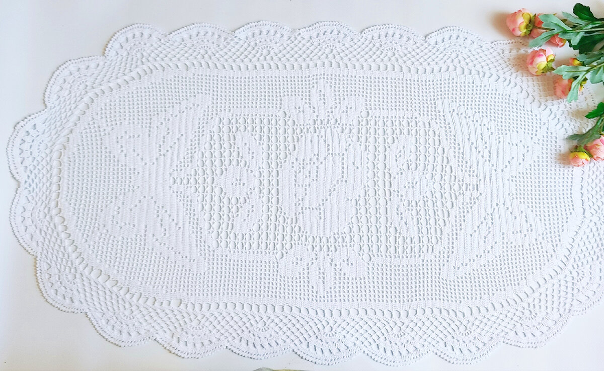 Здравствуйте, друзья! На днях я закончила работу над салфеткой, связанной в технике филейного вязания. Салфетка достаточно большая: более 70 ти см в длину и более 40 ка см в ширину. Пряжа- хлопок 100%. Работала над салфеткой я достаточно долго. Причин несколько: общая нехватка времени, отсутствие схемы, необходимость изучить теоретический материал о вязании подобных салфеток, поиск и заказ подходящей пряжи, проработка информации о том, как готовой салфетке придать конечный вид. И вот, наконец, я могу порадовать заказчицу (и,конечно,себя) результатом. Не всё получилось идеально, но в целом итогом я довольна. Считаю, что эта воздушная и нежнейшая красавица достойна занять почётное место в доме моей заказчицы и несомненно добавит уюта, тепла и особенной атмосферы. Если у вас возникнет желание связать такую салфетку, ниже схема самой салфетки и отдельным фото схема обвязки. Изначально одна схема к другой не имеет отношения. Дело в том, что я долго искала схему этой салфетки и нашла её