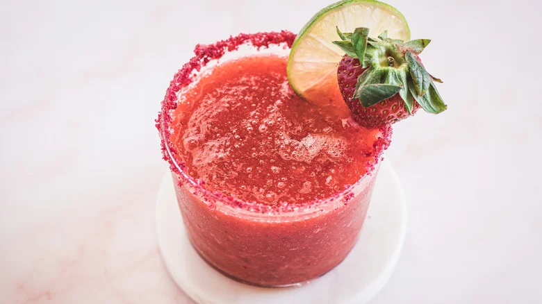 Прекрасный напиток - это сладкая, терпкая и освежающая маргарита из замороженной клубники. Она представляет собой симфонию вкусов, в которой морозная сладость клубники сочетается с оттенком бунтарского духа алкоголя. Это как отпуск в стакане, где каждый глоток уносит вас в тропический оазис или даже рай, и вот уже солнце целует вашу кожу, а океанский бриз шепчет вам на ухо свои сказки. Ингредиенты: 1 стакан замороженной клубники (измельченной) 1 лайм 1 ч. л. морской соли 5 ст. л. коньяка или водки 1 ст. л. сиропа/варенья 2 столовые ложки меда Как готовить: 1. Выложить в стакан или посуду для блендера замороженную клубнику и измельчить ее в пюре. 2. Взять немного пюре клубники и смешать с крупной солью. 3. Провести мякотью лайма по краю каждого стакана, затем опустить верхнюю часть стакана вверх дном в смесь ягод и соли, чтобы края равномерно покрылись. 4. В блендере к клубнике влить алкоголь, мед и сок лайма. Сироп по желанию. Взбить. 5. Перелить клубничную Маргариту в стаканы с соле