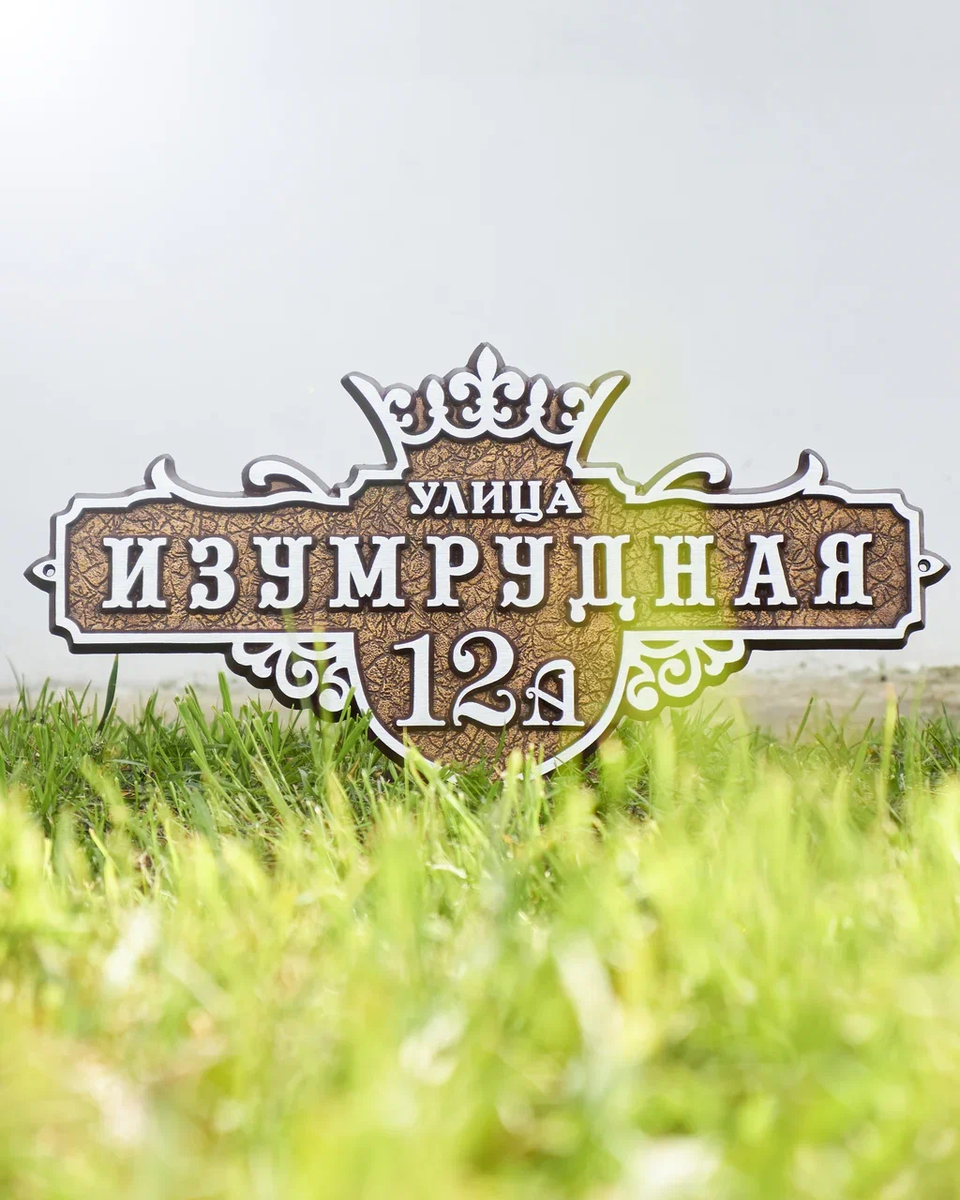 Индивидуальность КР-1 не подлежит сомнению и делает эту табличку самой популярной у наших клиентов. Именно потому, что она так любима нашими клиентами, мы часто делаем ее акционным товаром. В июне дарим вам скидку 40%! КР-1 выполнена в готическом стиле, основные черты которого – изящество, легкость, устремленность ввысь, богатая декоративность. Готический стиль как нельзя лучше соотносится с благородными сооружениями, поэтому его популярность не гаснет столетиями. Литая адресная табличка КР-1 в готическом стиле — это не только функциональное изделие, но и статусный предмет экстерьера. Изысканность КР-1 заключена в главном декоративном элементе – силуэте короны, расположенной по центру верхнего края таблички. Прямоугольный контур рамки украшен изящными вензелями и дополнен внизу округлым элементом, внутри которого расположен номер дома. Название улицы набрано крупным шрифтом с засечками. Цифры номера дома расположились в нижней части таблички. В качестве украшения использован цветочный