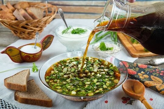 Окрошка - это один из самых любимых русских супов, особенно в жаркую погоду. Он обычно готовится на основе кваса, охлажденного мясного бульона или молока с кефиром. В этой статье мы рассмотрим рецепт вкусной окрошки на основе кваса. Ингредиенты: - 1 литр кваса - 1 куриное яйцо - 3 картофелины - 1 большой огурец - 1 маленькая луковица - 1 зеленый лук - 100 г говядины (лучше всего отварной) - 100 г ветчины - 100 г колбасы - 1 стакан кефира - 2-3 листа салата - 1 столовая ложка свежей зелени (укроп, петрушка, базилик) Приготовление: 1. Отварите яйцо и картофель в кипящей воде. Картофель должен быть мягким, но не развариваться. Яйцо отварите до твердости, затем нарежьте его кубиками. 2. Очистите и нарежьте огурец кубиками. 3. Лук нарежьте мелко (чем мельче, тем лучше). 4. Нарежьте говядину, ветчину и колбасу тонкими полосками. 5. Разрежьте салат на кусочки. 6. Смешайте все ингредиенты в большой миске: картофель, яйцо, огурец, лук, говядину, ветчину, колбасу и салат. 7. Добавьте к смеси к