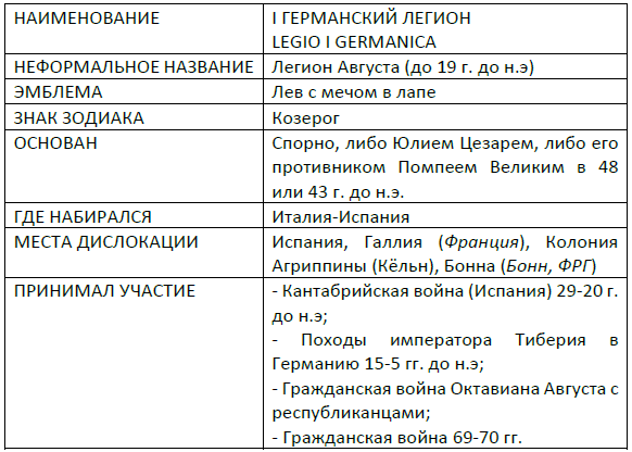 Кем именно был основан I ГЕРМАНСКИЙ ЛЕГИОН на сегодняшний день достоверно установить не удалось. Легион был основан либо Юлием Цезарем, либо его противником Помпеем Велики. Когномен «Германский» был присвоен легиону во времена императора Тиберия, наследника Октавиана Августа, до этого времени, у легиона был только номер без когномена. Во времена первого императора Октавиана Августа, легион назывался I Августов легион. Легион принял участие во всех ключевых сражениях гражданской войны. С этим названием, легион в составе армии Марка Випсания Агриппы, соратника и близкого друга императора Октавиана Августа, участвовал в Кантабрийской войне против племён астуров и кантабров на северном побережье современной Испании. Кантабрийская война 29-20 г. до н.э имела большой масштаб. Рим вынужден был задействовать не менее 8 кадровых легионов и множество вексилляций других легионов. Помимо сухопутной армии, в этой война активное участие принял и римский флот с западного побережья Галлии (Франция). В 19 г. до н.э, Марк Агриппа, за трусость и малодушие, лишает легион когномена «Августов» и передислоцирует в Галлию. В 9 г. до н.э, легион встал в Колонии Агриппины (Кёльн). Совместно с V Легионом Жаворонок, в зону ответственности I Легиона вошли земли на нижнем Рейне. После смерти императора Октавиана Августа в 14 г., легион, вместе с ещё 7 легионами на рейнской границе и 3 легионами в Паннонии (Венгрия) отказался присягнуть наследнику Октавиана, Тиберию. Племяннику Тиберия, Германику, удалось привести к присяге все 8 рейнских легионов, в том числе и I Легион. Почти сразу же после этих событий, I Легион зимой 14-15 годов, начал подготовку к войне с германскими племенами за Рейном – Рим готовил месть за разгром трёх легионов Квинтилия Вара в 9 г. В феврале 15 года, I Легион в составе армии Нижнего Рейна из четырёх легионов под командованием Цецины Севера переправился на другой берег Рейна.