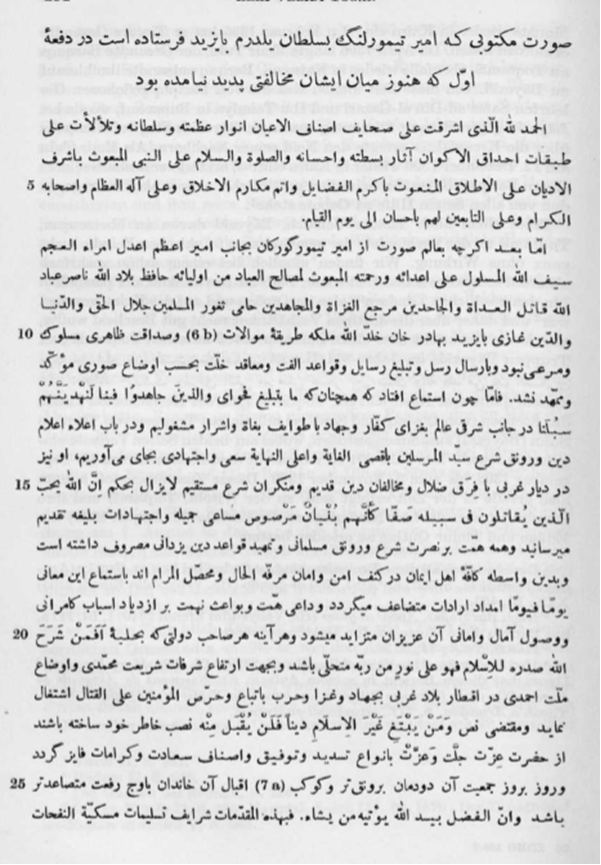 После [молитвы] этот экземпляр письма был написан Амиром Темуром, великим эмиром из Корагон, самым справедливым правителем мусульман, мечом Аллаха, который был готов сражаться против своих врагов. Убийца тиранов и неверных, агрессоров и моджахедов, защитник границ мусульманских земель, «правдивый и мирской религиозный лидер» (джалал ал-хак ваддунья ваддин), однако отношения между ними сотрудничества и дружбы не так сильны, как в памфлете.